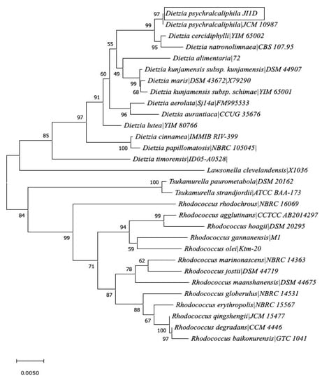 39. Rainey, F.A.; Klatte, S.; Kroppenstedt, R.M.; Stackebrandt, E. Dietzia, New Genus Including Dietzia maris comb. nov., Formerly Rhodococcus maris. Int. J. Syst. Bacteriol. 1995, 45, 32–36. [Google Scholar] [CrossRef] [PubMed][Green Version]