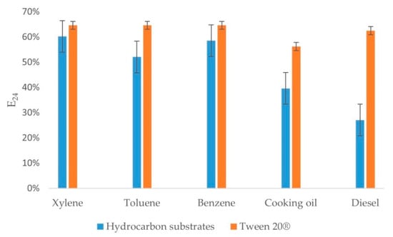 Figure 2. E24 assay results on different hydrocarbon substrates, such as xylene, toluene, benzene, cooking oil, and diesel. Tween 20® (Sigma-Aldrich, Darmstadt, Germany) is used as the positive control. Error bars represent the standard deviation values of three independent measurements.