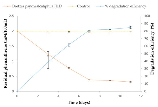 The biodegradation of phenanthrene by D. psychralcaliphila JI1D was quantified over time by HPLC, as described in Section 2.6.1. The residual concentration of phenanthrene in the abiotic control flasks on an average throughout the course of experiment was found to be 99.97 ± 0.00045%, indicating negligible or no loss of phenanthrene. At the end of 7 days of incubation, the culture was characterized with increased turbidity, emulsification of the phenanthrene crystals. The residual phenanthrene after 11 days was found to be 0.306 ± 0.014 mM, showing 84.66% of the phenanthrene was efficiently degraded (Figure 3). The biodegradation rate (Rx) of phenanthrene was calculated to be 0.1545 mM/day.
