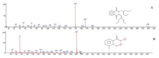 Figure 4. Depicting the GC-MS intermediates of phenanthrene degradation. The indicated fragmentation pattern shows (A) phthalic acid, di(2-propylpentyl) ester; (B) 3-methylsalicylic acid, 2TMS derivative.