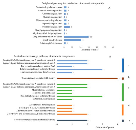 Figure 6. Number of genes involved in the catabolism of the aromatic compounds in D. psychralcaliphila JI1D by the peripheral (A) and central meta-cleavage (B) pathways, respectively (Table 2). Hydroxyphenyl acetic acid catabolic pathway.