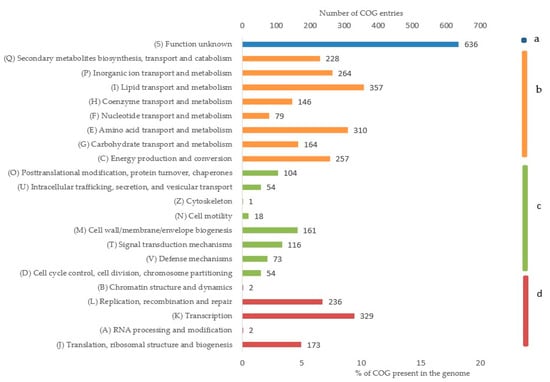 The functional annotation of the whole genome was performed by eggNOG-Mapper by assigning a minimum hit e-value of 0.001, minimum hit bit-score of 60, and minimum % of query coverage of 20. The predominant classes of COGs belonged to unknown functions (16.89%), followed by lipid transport and metabolism (9.48%), transcription (8.74%), amino acid transport and metabolism (8.23%), and inorganic ion transport and metabolism (7.01%) when normalized with the total number of entries, as shown in Figure 7, with details in Supplementary Table S5. The domain annotation was performed through All-1.0.3 and 14,300 protein domains were annotated. Of which, CDD counted for 3480 domains, TIGRFAMs for 760 domains, PRK for 4855 domains, and SMART for 221 domains.