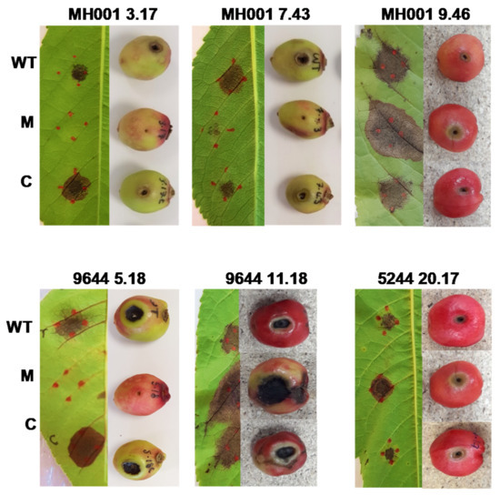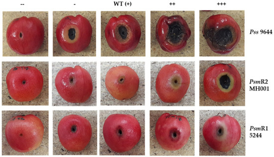 Libraries of transposon mutants were made of the three pathogenic strains—Pss 9644, Psm 5244 and Psm MH001. Due to the relative inefficiency of the conjugation process, and a desire to test the proof of principle of this approach, 940 Tn mutants per library were chosen. The libraries were screened for changes in pathogenicity on unripe detached cherry fruit. Each insertion mutant was picked directly from a colony using a sterile cocktail stick and stabbed into fruit. Each mutant was tested three times and the symptoms scored and photographed after five days incubation at 23 °C. Symptoms were scored compared to WT, Figure 1 illustrates the range of symptoms observed.