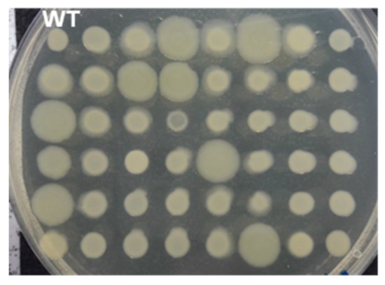 Screening of Pseudomonas syringae transposon disruption mutants for changes in colony morphology. Tn mutant colonies (48) were inoculated onto standard agar plates and changes in colony morphology recorded after 72 h, Colonies were replica plated in a 48 grid pattern with the wild-type (WT) strain at position 1. Plate contains 47 P. syringae pv. morsprunorum R2 MH001 transposon mutants.