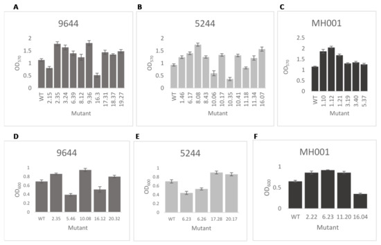 Selected Pseudomonas syringae transposon disruption mutants in biofilm attachment assay and in vitro growth rate. Transposon mutants and wild-type strain (WT) were cultured static in 10 mL broths. After seven days, crystal violet was used to measure (OD570) the attachment of the cells to the culture vessel surface (A–C). Differences in in vitro growth were analysed after 8 h growth in LB broth (D–F). (A,D) P. syringae pv. syringae 9644; (B,E) P. syringae pv. morsprunorum R1 5244; (C,F) P. syringae pv. morsprunorum R2 MH001. The mutants displayed show a statistically significant difference to their respective WT strain determined, p < 0.05 as assessed by Student’s t-test. Error bars represent the standard error of the mean of three biological replicates.