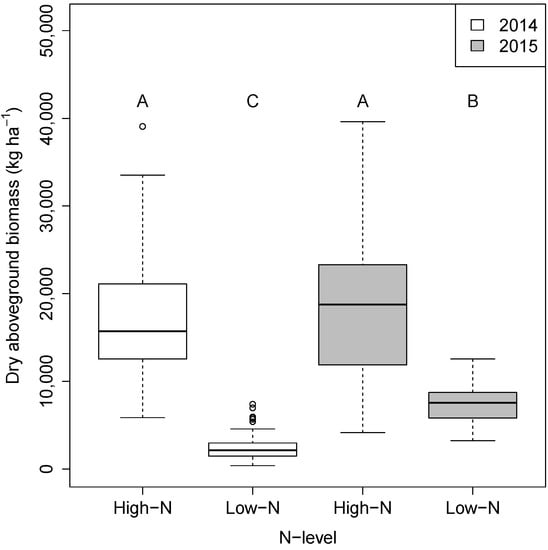Changes in dry aboveground biomass between plants grown at different N levels. Box plots of the dry aboveground biomass (Kg ha−1) of all genotypes planted in the high- and low-N fields in 2014 and 2015. Different letters indicate significant differences according to Tukey test (p < 0.05).