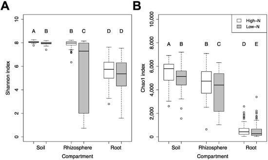 Differences in α-diversity between the three compartments and two N-levels. Box plots of α-diversity at two N-levels in soil, rhizosphere, and root endosphere compartments in both years sampled. (A) Differences in species diversity calculated by the Shannon index; and (B) differences in species richness calculated by the Chao1 index. Different letters indicate significant differences according to Wilcoxon’s pairwise test.