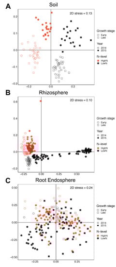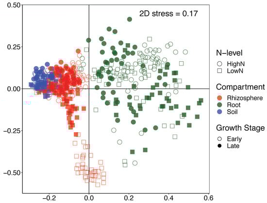 The β-diversity was also changed due to the factors analyzed in our study. A multivariate permutative analysis of variance (PERMANOVA) showed significant differences between compartments, N-levels, years, and growth stages, including significant interactions among all these factors (p < 0.001). PERMANOVA also revealed that the largest effect size on the bacterial communities was due to compartment (R2 = 0.132), followed by N-level (R2 = 0.030), growth stage (R2 = 0.022) and year (R2 = 0.017). A non-metric multidimensional scaling (NMDS) grouped the samples according to compartment, since this was the dominant factor influencing bacterial community structure (Figure 3).