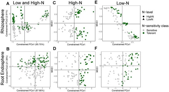 β-diversity differences between N-stress tolerant and sensitive genotypes. Canonical analysis of principal coordinates (CAP) based on the Bray-Curtis distance matrices considering samples from both N-levels in the (A) rhizosphere, and (B) root endosphere, as well as samples from only the high-N field in the (C) rhizosphere, and (D) root endosphere, and samples from only the low-N field in the (E) rhizosphere, and (F) root endosphere. Soil N-levels are represented with different symbols, while sorghum genotype N-stress sensitivity classes are represented with different colors.