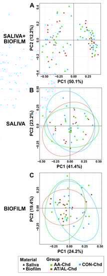 PCoA plot showing the relatedness between the microbiota’s structure of AA-Chd (green), AT/AL-Chd (red) and CON-Chd (blue) for both saliva and biofilm (A), saliva alone (B), and biofilm alone (C). The PCoA plots were based on the Morisita–Horn distance. Ellipses represent the 95% confidence ellipse based on a multivariate t-distribution.