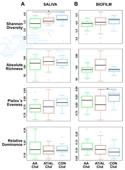 In terms of α-diversity (Figure 2), the saliva microbiome revealed a significant increase of diversity (Shannon index) in the CON-Chd compared to AA-Chd, but no significant differences with regard to richness, Pielou´s evenness, and dominance (Figure 2A).