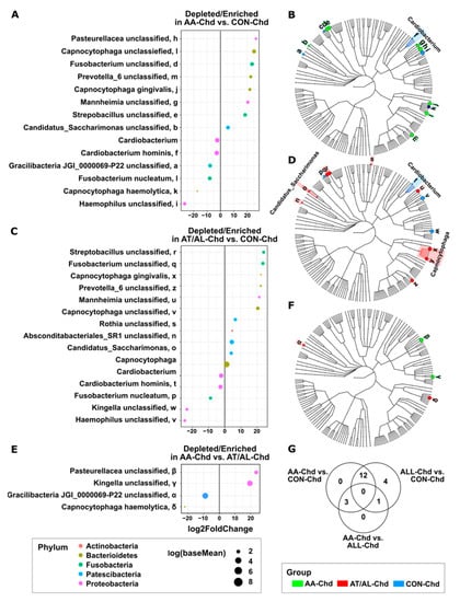 Differentially abundant taxa between the groups in biofilms. (A) Log2 fold change between AA-Chd and CON-Chd, (B) between AT/AL-Chd and CON-Chd (C), as well as between AA-Chd and AT/AL-Chd (E). Cladograms showing the most differentially abundant taxa enriched in microbiota from AA-Chd (green) and CON-Chd (blue) (B), AT/AL-Chd (red) and CON-Chd (blue) (D) as well as AA-Chd (green) and AT/AL-Chd (red) (F). (G) Venn diagram illustrating unique and shared species among child group comparisons.