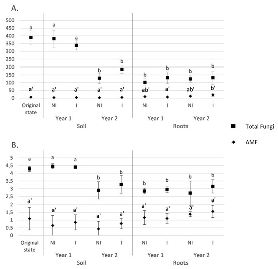 According to the Chao1 index, the fungal richness in soil was stable between the soil before sowing and year 1 but significantly decreased between year 1 and year 2 for both NI and I treatments (Figure 1A). No significant difference was observed between I and NI treatments. It is noteworthy that richness measured in roots, regardless of the treatment, were similar to those obtained from soil in year 2 and, hence, were lower than those measured in soil in year 1. In addition, in roots, the fungal richness was found to be equivalent, regardless of the treatment or monitoring time. Regarding AMF richness, the results showed that it was similar in soil, regardless of the treatment or monitoring time. In roots, a significant richness increase between year 1 and year 2 was only observed for the I treatment (p < 0.05). However, no significant difference was observed between NI and I treatments. In addition, similar values were obtained in soil and roots, except for the I treatment in year 2.