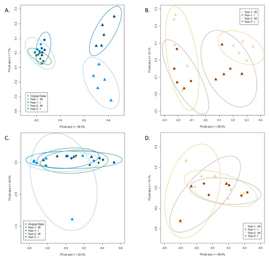 For the ITS data set, a total of 761, 696, 644, 206, and 343 fungal ASVs were identified in the soil before sowing, in year 1 (NI and I), and in year 2 (NI and I) treatment samples, respectively, while a total of 221, 294, 214, and 251 fungal ASVs were present in the root biotope for year 1 (NI and I) and year 2 (NI and I) treatments, respectively (Figure S2A,B). The total number of ASVs significantly decreased by about 60% in year 2, regardless of the treatment, depicting a net shift between year 1 and year 2. It is noteworthy that, in year 2, for the I treatment, the drop in the total number of ASVs was lower in comparison with the NI treatment (Figure S2A). In the roots, equivalent numbers of ASVs were shared between I and NI treatments and between the successive years (Figure S2B). However, higher numbers of total ASVs were highlighted for the I treatment, in comparison with the NI one, regardless of the year.