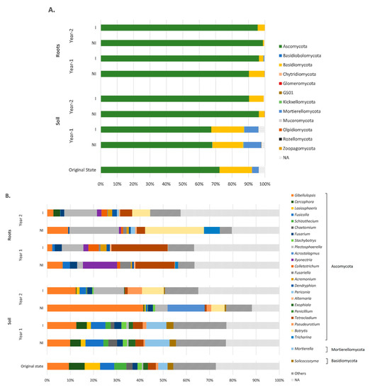 Relative abundances of major phyla (A) and genera (B) of the fungal ITS rRNA gene data set, according to the different experimental conditions for both root and soil biotopes. The genera were grouped by phylum, and those with a relative abundance lower than 0.5% were gathered in the “Others” group. NI: non-inoculated; I: inoculated; NA: non-assigned.