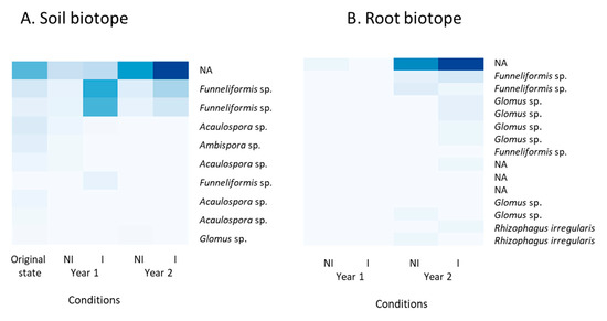 Heatmap representation based on the abundance of the 10 and 15 most-represented ASVs from the 18S rRNA gene data set identified in the rhizospheric soil (A) and root (B) biotopes, respectively. NI: non-inoculated; I: inoculated; NA: non-assigned.