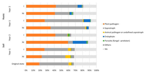 Relative abundances of major fungal functional groups of the ITS rRNA gene data set, according to the different experimental conditions for both root and soil biotopes. The guilds with a relative abundance lower than 0.5% are gathered in the “Others” group. NI: non-inoculated; I: inoculated; NA: non-assigned.