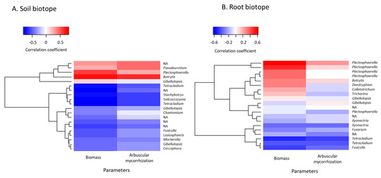 Heatmap representation based on the correlation coefficients between clary sage biomass (dry weight) or arbuscular mycorrhization and the 20 most represented fungal ASVs from the ITS data set in soil (A) and root (B) biotopes. They respectively belong to 12 and 10 fungal genera. NA: non-assigned.