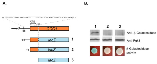 The 58 bp region located immediately upstream the translation initiation codon of CCC1 has promoter activity. (A) Schematic representation of the plasmids 1 (yEp356R−58), 2 (yEp356R+1) and 3 (vector yEp356R). In 1, the 58 bp region of CCC1 promoter along with the first 109 bp of the coding sequence of CCC1 were cloned in frame with lacZ. In 2, only the 109 bp region was cloned in frame with the reporter gene sequence. (B) Wild type cells were transformed with plasmids 1, 2 or 3 and β-galactosidase levels were detected by immunoblotting, using an anti-β-galactosidase antibody. Pgk1 levels were used as a loading control. β-galactosidase activity was assayed by spotting 3.5 × 107 stationary phase cells transformed with the indicated constructs in SD plates. Plates were incubated at 30 °C, until the development of blue color, after overlay with X-gal/agarose mixture.