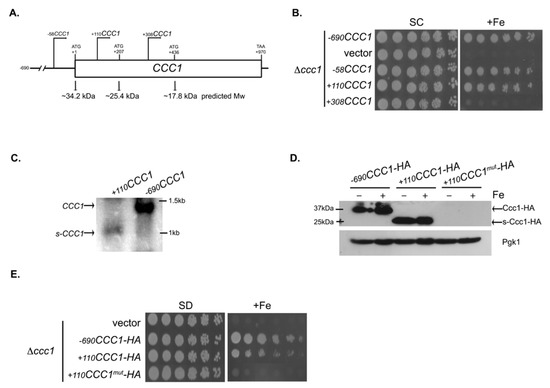 The molecular weight of s-Ccc1 (approximately 25 kDa) suggests that translation initiates at the AUG codon located at position +207 bp (Figure 3A). We therefore mutated the corresponding methionine to leucine (M70L) in the +110CCC1-HA construct and introduced the resulting plasmid, +110CCC1-HAmut, into Δccc1 cells. Results from this experiment show that the M70L mutation completely abrogates protein expression (Figure 3D), confirming that the +207 AUG is the initiation codon of the truncated protein. Accordingly, cells containing this plasmid were no longer able to support excessive Fe concentrations (Figure 3E).