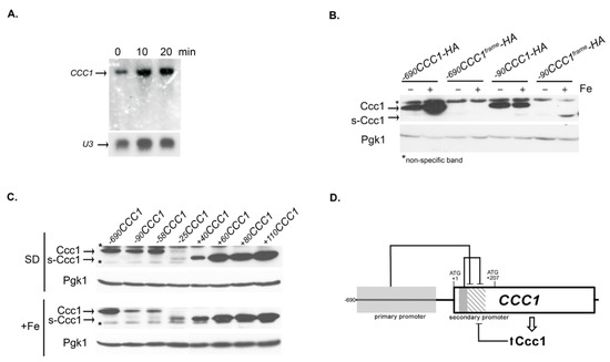 In this work we have uncovered one additional mechanism of CCC1 regulation that leads to the expression of a functional in-frame amino-terminal truncated protein still capable of mediating iron accumulation in the vacuole. The existence of this alternative transcriptional pathway of CCC1 reinforces the idea that Ccc1 might be regulated through several different mechanisms.