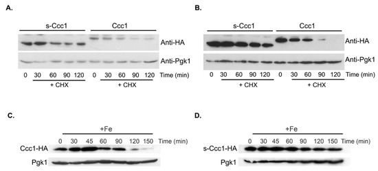 As such, Ccc1-HA and s-Ccc1-HA protein stability was evaluated by cycloheximide (CHX) chase assays. Briefly, Δccc1 cells were transformed with −690CCC1-HA or +110CCC1-HA plasmids to monitor Ccc1-HA and s-Ccc1-HA expression, respectively. Cells were left untreated or treated with 2 mM of FeSO4 for 30 min, exposed to 100 µg/mL of CHX and harvested at the indicated time points (Figure 5). We found that the presence of Fe in the medium increases the degradation rate of both proteoforms, with s-Ccc1 being always more stable than Ccc1 (Figure 5A,B and Figure S4). Interestingly, the RAPID prediction tool [38], revealed that Ccc1 has a higher percentage of intrinsically disordered residues (61 out of 322 residues; 18.9%) when compared to s-Ccc1 (3 out of 253 residues; 1.2%), which is a known determinant of protein degradation rates. Moreover, while Ccc1 levels respond readily to Fe availability, peaking at 45 min after treatment and then rapidly decreasing, the levels of s-Ccc1 do not decrease as rapidly over the treatment period (Figure 5C,D).