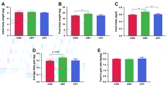The average body weight of piglets increased from 8.21, 8.10 and 8.31 kg at initial for the CON, COT and CMT groups (Figure 1A), respectively, to 17.64, 17.74 and 19.24 kg in the end (Figure 1B). The CMT group was larger in the FI compared with the CON group (p < 0.05) and the COT group (p < 0.05), which increased by 13.9% and 11.6% respectively (Figure 1C). These correspondingly tended to have larger ADG compared with the CON group (p = 0.09), which increased by 15.9% (Figure 1D). Compared with the CON group, the COT group only slightly increased the FI and the ADG by 2.1% which were not significant. The difference on feed to gain ratio among the groups was not significant, although the CMT group slightly reduced it by 1.5% whereas the COT group increased it by 1.7% compared with the CON group (Figure 1E).