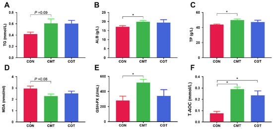 Effects of COT and CMT treatments on serum indices of piglets. (A) TG. (B) ALB. (C) TP. (D) MDA. (E) GSH-PX. (F) T-AOC. Star (*) indicates that there are significantly different (at the 5% threshold of the ANOVA) between groups.
