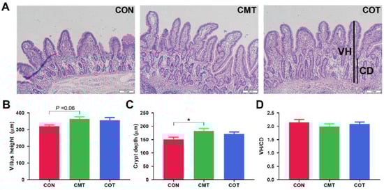 The epithelial structure of the ileum in piglets from each group was normal, and the intestinal mucosa was intact without significant pathological changes (Figure 3A). The CMT group had an increased trend in villus length compared with the CON group (p = 0.06, Figure 3B). The crypt depth was significantly higher in the CMT group than in the CON group (p < 0.05, Figure 3C). There was no significant change in the ratio of VH/CD among the different groups (Figure 3D).