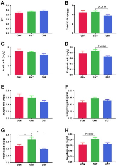 There was no significant difference in the pH value of the colon of the piglets among the three groups (Figure 4A). The CMT group had an increased trend in the content of total SCFAs (p = 0.06, Figure 4B) and propionic acid compared with the COT group (p = 0.06, Figure 4D). The CMT group had a significantly higher valeric acid content than the CON group (p < 0.05, Figure 4G) and the COT group (p < 0.05, Figure 4G). The CMT group also had an increased trend in the isovaleric acid content compared with the CON group (p = 0.06, Figure 4H).