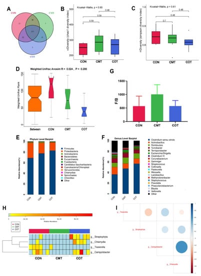 Venn diagram showed that there were 359 and 345 common bacterial groups between the CON group and the CMT group, and between the CON group and the COT group, respectively. There were 17, 3 and 7 unique taxa in the CON, COT, CMT groups, respectively (Figure 5A) determined by Wilcoxon signed-rank test. No significant difference was found in alpha diversity such as Chao1 index and Simpson index among the three groups (Figure 5B,C). The visualization of beta diversity showed that the experimental treatment is meaningful (R > 0, Figure 5D). The relative abundance of bacterial taxa at the phylum (Figure 5E) and genus level (Figure 5F) in piglets from different groups were shown. The phyla Firmicutes showed a tendency to increase in abundance in the experimental groups compared with the CON group (Figure 5E). The genus of Clostridium sensu stricto also showed a tendency to increase in abundance in the experimental groups compared with the CON group (Figure 5F). The ratio of Firmicutes/Bacteroidetes (F/B) tended to increase in the CMT group compared with the CON group (Figure 5G). The heatmap summarized the differences of three groups of bacteria at the genus level namely Streptophyta, Chlamydia, Tissierella and Campylobacter (Figure 5H). Spearman correlation test showed that there was a positive correlation between Campylobacter and Chlamydia (Figure 5I).