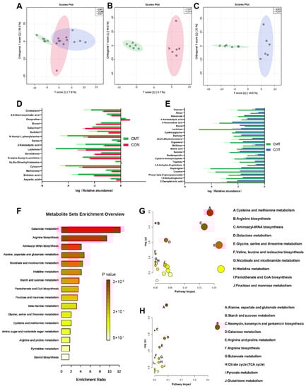 In this study, 686 peaks were detected and 482 metabolites were left after relative standard deviation de-noising. Supervised orthogonal projections to latent structures-discriminate analysis (OPLS-DA) were applied (Figure 6A–C) to visualize group separation and find significantly changed metabolites. The OPLS-DA model among different groups were as follows: R2X = 0.653, R2Y = 0.824, and Q2 = 0.279 (Figure 6A). The OPLS-DA model between the CMT group and the CON group were as follows: R2X = 0.67, R2Y = 0.973 and Q2 = 0.632 (Figure 6B). The OPLS-DA model between the CMT group and the COT group were as follows: R2X = 0.336, R2Y = 0.918, and Q2 = 0.568 (Figure 6C). The Q2 values all exceeded 0.4, indicating that these models were more reliable and that consistent modeling and predictability were achieved. However, the OPLS-DA model between the COT group and the CON group were as follows: R2X = 0.626, R2Y = 0.646, and Q2 = −0.0417 (Figure S3A). Subsequently, we detected 25 differential metabolites among the three groups. There were 17, 23 and 11 differential metabolites in the CON, CMT and COT groups, respectively (Figure 6D,E, Figure S3B).