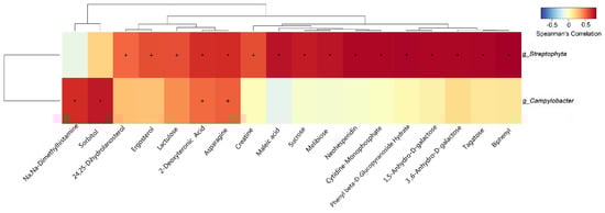 The correlation between differential gut bacteria and metabolites among the three groups was expounded by Spearman correlation analysis (Figure 7). The genus Streptophyta was strongly positively correlated with 2-deoxytetronic acid, aspartic acid, melibiose, maleic acid, sucrose, neohesperidin, phenyl β-D-glucopyranoside hydrate, cytidine monophosphate, 1,5-anhydroglucitol, 3,6-anhydro-D-galactose, tagatose and biphenyl (p < 0.05), and highly positively correlated with 24,25-dihydrolanosterol, ergosterol, lactulose and creatine (p < 0.05). The genus Campylobacter was strongly positively correlated with Na, Na-dimethylhistamine and sorbitol (p < 0.05), and highly positively correlated with 2-deoxytetronic acid and aspartic acid (p < 0.05).