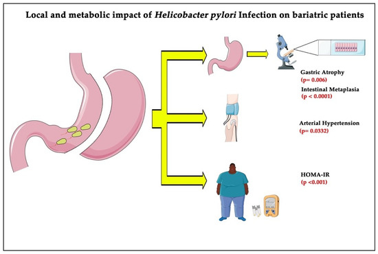 Patients undergoing bariatric surgery were significantly associated with gastric atrophy, intestinal metaplasia, arterial hypertension, and increased insulin resistance when infected with Hp, compared to the noninfected patients. HOMA–IR, homeostasis model assessment–insulin resistance method.