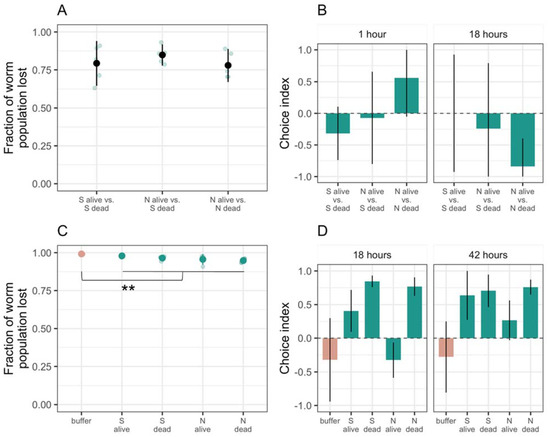 In a binary choice assay, we inoculated two circular patches of M. xanthus on an agar surface and added L1 larval worms to a bacteria-free region of the plate, equidistant from the two M. xanthus patches. In this assay, we counted how many worms left the plate vs. remained on the plate after 1 and 18 h and, of those that remained, how many entered one or the other of the M. xanthus patches. In most replicates, regardless of the options provided, large majorities of the worm populations emigrated from the dish (>75% on average), and there was no general difference in the rate of emigration as a function of M. xanthus strain identity (ANOVA bacterial identity factor F2,12 = 0.8, p = 0.5, Figure 2A). Those who stayed demonstrated no clear general preference between live vs. dead patches across both strains and both examined time points (1 and 18 h, ANOVA choice:time interaction F2,24 = 5.67, p < 0.01, post hoc Tukey HSD tests p > 0.2; Figure 2B and Figure S1A). One exception to the general lack of a strong effect of M. xanthus death occurred on dishes containing the motility mutant strain N. On these plates, the worms seemed to initially prefer the live strain N patch after 1 h but then changed their preference to the dead patch by 18 h (post hoc Tukey HSD test p = 0.01). Because no similar pattern was seen for strain S, this result suggested that the effect of death on the attractiveness of bacterial cells to nematode predators can vary across conspecific genotypes.