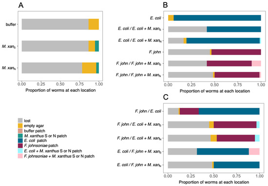 C. elegans prefers prey patches not containing M. xanthus. Here we show worm locations relative to two circular prey patches after 25 h on plates where either (A) the patches contained either buffer or M. xanthus, (B) one patch contained E. coli or F. johnsoniae and the other patch contained the same with or without pre-mixed M. xanthus, or (C) one patch contained E. coli or F. johnsoniae and the other patch contained the other prey species with or without pre-mixed M. xanthus. Worms found on the plate but not in a patch are indicated in yellow, and worms that had left the plate by 25 h are indicated in grey. Bars are mean worm counts from three biological replicates. Raw data are shown in Figure S2. ‘F. john’ = F. johnsoniae, ‘M.xanN’, ‘M.xanS’ = M. xanthus strains N and S, respectively.