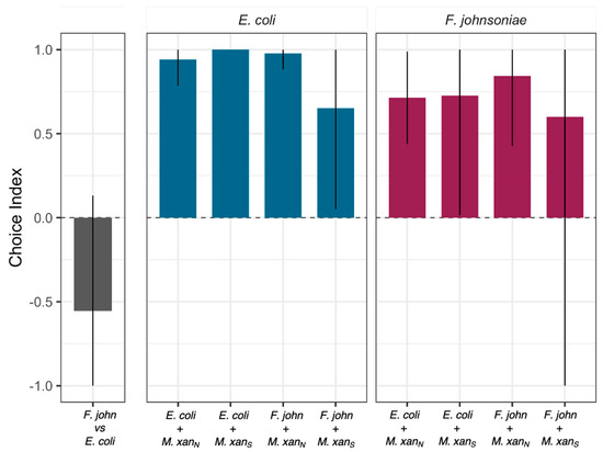 Choice indices for circular patches of basal prey. The leftmost section shows the prefe-rence of C. elegans for E. coli over F. johnsoniae. The next two sections show the choice of the worms between a mono-species patch of basal prey (indicated above the panel, E. coli = blue or F. johnsoniae = red) and a second patch (indicated on the x-axis) consisting of basal prey mixed with M. xanthus either strain S or strain N. Bars are means from three biological replicates and error bars are 95% confidence intervals. For the choice E. coli/E. coli + M. xanS the error bar is zero. In some instances, 95% confidence intervals extend outside the range of what is biologically possible, [−1,1], so we restricted them to reflect the biological reality. ‘F. john’ = F. johnsoniae, ‘M.xanN’, ‘M.xanS’ = M. xanthus strains N and S, respectively.