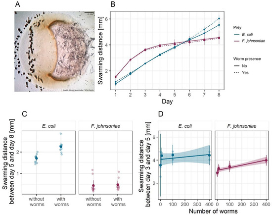 C. elegans presence increases M. xanthus predatory swarming rate. (A) Picture of C. elegans (right) and M. xanthus strain S (orange lawn and black fruiting bodies on the left) preying upon an E. coli patch (raised circle). We estimated the predatory performance of M. xanthus as the swarming distance along the horizontal midline of the prey patches of E. coli (blue) and F. johnsoniae (red). We show the swarming distance over time (B) in the presence (dotted lines) and absence (solid lines) of C. elegans’ populations initiated with 10 worms (which started reproducing at day 5), and the associated total swarming distances between days 5 and 8 (C) from the same experiment. Panel (D) depicts the total swarming distances between days 3 and 5 in the presence of different numbers of C. elegans (the worms did not reach maturity until day 5 and so did not reproduce during this experiment). Each large dot is the mean of ten (B,C) or three (D) biological replicates (shown as transparent dots). Error bars and shaded areas represent 95% confidence intervals of the means and the regression lines, respectively.