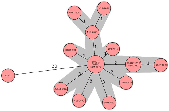 Sequence types (STs) were determined using a 7 house-keeping gene-based MLST scheme and Ridom SeqSphere+ software version 7.2.3 (Ridom GmbH, Münster, Germany). Sequences were blasted against a cgMLST scheme based on a 3002-locus cgMLST scheme using Ridom SeqSphere+. Complex types (CTs) were assigned upon submission to the Salmonella cgMLST Ridom SeqSphere+ server (https://www.cgmlst.org/ncs/schema/4792159/ accessed on 4 May 2021). A cluster was defined as a group of isolates with ≤10 different alleles between neighboring isolates. High-quality SNPs were identified by mapping reads against the draft assembly of the strain 50,722 using the CFSAN SNP pipeline [26]. A maximum-likelihood phylogenetic tree was constructed from the SNP matrix using IQ-TREE v2.0.3 [27] with the generalized time-reversible (GTR) model and gamma distribution with 100 bootstraps to assess confidence. The number of invariant sites was estimated from a core genome alignment generated with parsnp [28] and passed to IQ-TREE.