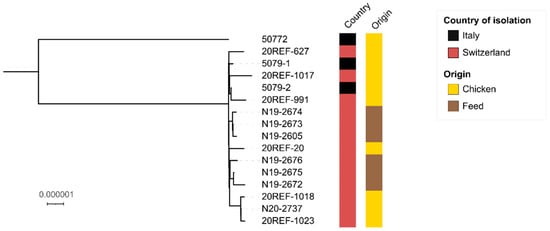 The aim of this study was to further characterize the available S. Jerusalem isolates from Swiss feed and poultry by whole-genome sequencing, to compare them to available Italian isolates from the poultry environment, and to identify a possible epidemiological link.