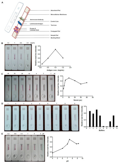 A representative diagram of a typical lateral flow assay (LFA) (A). Optimization of LFA for serum-based diagnosis of visceral leishmaniasis (VL) with 0.1, 0.5, 1 and 1.5 mg/mL of leishmanial antigen, LAg (B). Standardization of the volume of undiluted sera with 1, 2, 4, 10, 20, 30 and 40 µL of serum per test (C). Selection of the optimal chase buffer for the assay, 1, 10 mM Tris; 2, 10 mM Tris + 0.05% Tween 20; 3, 20 mM Tris buffer saline + 0.05% Tween 20 (TBST); 4, buffer provided with rK39 test; 5, 20 mM borate buffer; 6, 20 mM phosphate buffer saline (PBS); 7, 20 mM Hepes; 8, 5% BSA + 9% NaCl + 0.05% Tween 20; 9, distilled water (D). LFA using TBST chase buffer at different pH levels: 9.2, 8.8, 7.4, 7, 6 and 4 (E). The graphs plotted on the right denote the relative means of the test line intensities obtained by ImageJ 1x (National Institutes of Health (NIH), Bethesda, MD, USA).