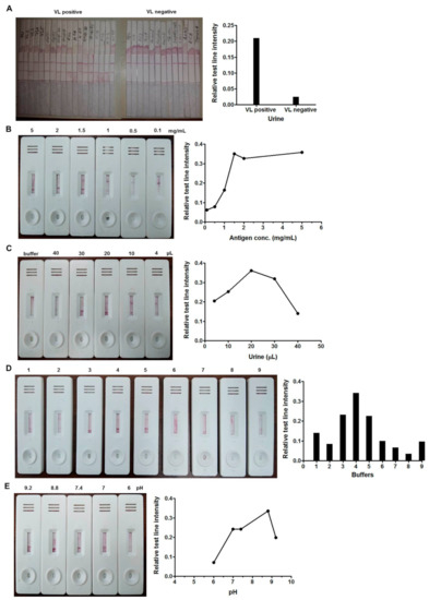 Lateral flow assay (LFA) under wet condition with VL-positive and negative samples (A). Optimization of LFA for urine-based diagnosis of VL with 0.1, 0.5, 1, 1.5, 2 and 5 mg/mL of leishmanial antigen, LAg (B). Standardization of the volume of 4, 10, 20, 30 and 40 µL of undiluted urine sample per test including buffer as a control (C). Selection of the optimal chase buffer for the assay, 1, 10 mM Tris; 2, 20 mM borate buffer; 3, buffer provided with rK39 test; 4, 10 mM Tris + 0.05% Tween 20; 5, 20 mM Tris buffer saline + 0.05% Tween 20 (TBST); 6, 20 mM phosphate buffer saline (PBS); 7, 20 mM Hepes; 8, distilled water; 9, 5% BSA + 9% NaCl + 0.05% Tween 20 (D). LFA using chase buffer 10 mM Tris with Tween 20 at different pH levels: 9.2, 8.8, 7.4, 7 and 6 (E). The graphs plotted on the right denote the relative means of the test line intensities obtained by ImageJ.