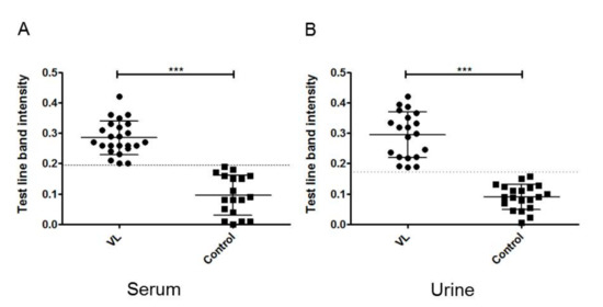 Dot plot graph obtained by the analysis of test line intensities of 24 visceral leishmaniasis (VL)-positive and 18 healthy Indian sera (A) and 20 VL-positive and 20 healthy urine samples (B) in lateral flow assay. The cut-offs (dotted lines) were obtained by GraphPad prism and the receptor operative characteristic (ROC) curve, at which the maximum sensitivity and specificity were achieved. Two-tailed Mann–Whitney U tests were performed to compare the intensities of VL-positive and healthy control samples, where p values < 0.05 were statistically significant (*** represents p values < 0.0001). Each dot denotes the test line intensity obtained from a single sample and the solid horizontal lines show mean ± standard error of mean (SEM).