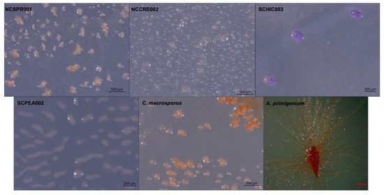 Sequencing for all samples was performed on a Pacific Biosciences single-molecule real-time (SMRT) sequencing platform at the MR DNA facility (Shallowater, TX, USA). The SMRTbell libraries for the sample were prepared using the SMRTbell Express Template Prep Kit 2.0 (Pacific Biosciences, Menlo Park, CA, USA) following the manufacturer’s user guide. Following library preparation, the final concentration of each library was measured using the Qubit® dsDNA HS Assay Kit (ThermoFisher Scientific, Suwanee, GA, USA), and the average library sizes were determined using the Agilent 2100 Bioanalyzer (Agilent Technologies, Santa Clara, CA, USA). Each library pool was then sequenced using the 10-h movie time on the PacBio Sequel (Pacific Biosciences, Menlo Park, CA, USA). De Novo Assembly of each genome was accomplished using the PacBio SMRT Analysis Hierarchical Genome Assembly Process (HGAP). Genome annotation was done using Rapid Annotation using Subsystem Technology (RAST) with further annotation requested by the NCBI Prokaryotic Genome Annotation Pipeline [52]. Sequencing data have been deposited in NCBI under the accession numbers JADWYI000000000.1, JAFIMU000000000, JAFIMS000000000, JAFIMT000000000, CP071090, and CP071091 for strains A. primigenium, C. macrosporus, NCSPR001, NCCRE002, SCPEA002, and SCHIC003, respectively.