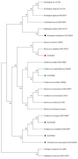 - Chambers, J.; Sparks, N.; Sydney, N.; Livingstone, P.G.; Cookson, A.R.; Whitworth, D.E. Comparative Genomics and Pan-Genomics of the Myxococcaceae, including a Description of Five Novel Species: Myxococcus eversor sp. nov., Myxococcus llanfairpwllgwyngyllgogerychwyrndrobwllllantysiliogogogochensis sp. nov., Myxococcus vastator sp. nov., Pyxidicoccus caerfyrddinensis sp. nov., and Pyxidicoccus trucidator sp. nov. Genome Biol. Evol. 2020, 12, 2289–2302. [Google Scholar] [CrossRef]