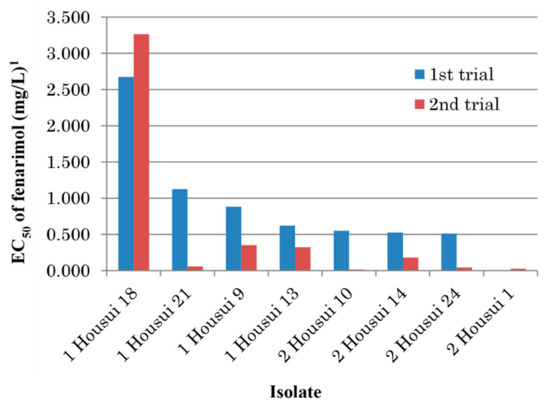Mycelial growth tests were repeated on fenarimol-amended and unamended PDA using eight single-spore isolates collected from Kurokawa, Fukuoka, in 2005. As a result, except for the isolate Kurokawa 22, EC50 values of fenarimol decreased for all of the seven other isolates after storage in the absence of the fungicide (Table 6). Noticeably, the value for the isolate Kurokawa 21 decreased from 21.300 mg/L in the 1st trial to 1.721 mg/L in the 2nd trial, respectively. To confirm the instability of resistance in culture, similar experiments were conducted in 2018 using the eight other single-spore isolates obtained in the previous year. Sensitivity to fenarimol increased in seven isolates except the isolate 1 Housui 18 for which the EC50 value changed from 2.675 mg/L to 3.264 mg/L (Figure 2).