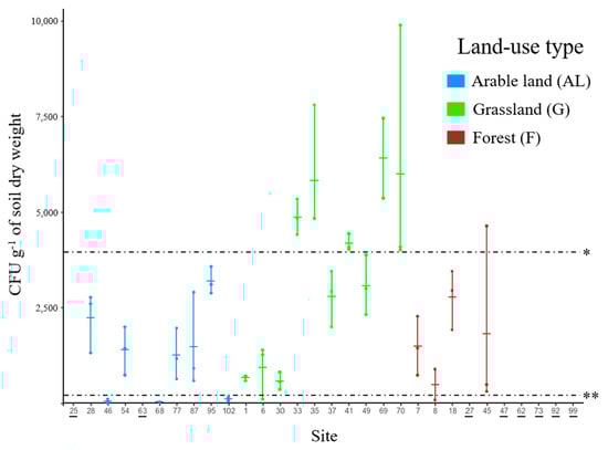 Metarhizium spp. abundance represented as dot plots of colony-forming units (CFU g−1 of soil dry weight) for different sites (30 NABObio sites). Dots represent values of CFU g−1 of soil dry weight in each sample per site, and the intersection represents the mean of CFU g−1 of soil dry weight per site. * Dashed line (4000 CFU g−1 of soil dry weight) separates the high abundance group from the medium abundance group; ** Dashed line (150 CFU g−1 of soil dry weight) separates the medium abundance group from the low abundance group) (Table S3). Site numbers where Metarhizium was not detected are underlined.