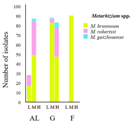 Number of isolates recovered for the three species identified (M. brunneum, M. robertsii, and M. guizhouense) in each of the three land-use types—arable land (AL), grassland (G), and forest (F)—separated according to the three abundance groups, low (L), medium (M), and high (H) (see Figure 1).