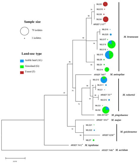 Genotyping of the isolates based on microsatellite analyses revealed 22 different MLGs among the 349 isolates: 13 MLGs for M. brunneum, 6 MLGs for M. robertsii, and 3 MLGs for M. guizhouense, revealing that these microsatellite-based MLGs were species-specific (Figure 3 and Table 2). Overall, the number of detected MLGs was similar in arable land and grassland, while it was 2.5 to 3 times lower in forest. For M. brunneum, the number of MLGs was higher in grassland compared to arable land and forest, whereas for M robertsii, the number of MLGs was higher in arable land. Shannon–Wiener genetic diversity (H) for M. brunneum was highest in permanent grassland, followed by arable land and forest, while for M. robertsii, diversity was higher in arable land and lower in grassland (Table 2). In contrast, the evenness (E.5) of M. brunneum was higher in forest compared to grassland and arable land, and the evenness of M. robertsii was higher in grassland compared to arable land (Table 2). Due to the low number of M. guizhouense isolates identified, diversity indices for this species were not calculated.