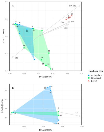 Principal coordinate analysis (PCoA) based on a Bray–Curtis dissimilarity matrix showing differences between (A) M. brunneum and (B) M. robertsii populations at the sites of three land-use types: arable land, grassland, and forest. Circles (arable land), squares (grassland), and triangles (forest) represent M. brunneum or M. robertsii populations at the different sites (site numbers indicated). Convex hulls enclose samples of the same land-use type. The percentage of variation explained by the plotted principal coordinates is indicated on the axes. Vectors represent the best fitted and explained environmental factors, and vector lengths represent the strength of correlation. C:N ratio: ratio of organic carbon and total nitrogen; Ctot: total carbon; Corg: organic carbon; BR: basal respiration; BD: bulk density; SS: soil skeleton.